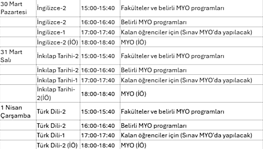 25 Mar 20262025-2026 BAHAR DÖNEMİ ZORUNLU ORTAK DERSLER ARA SINAV TARİHLERİ2025–2026 Eğitim-Öğretim Yılı Bahar Dönemi kapsamında yürütülen zorunlu ortak derslere ait ara sınavlar, aşağıda belirtilen tarihlerde gerçekleştirilecektir.